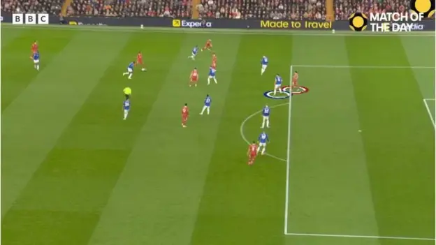 Ryan Gravenberch tried to pass to Diaz, who was standing in an offside position. Diaz made no attempt to move towards the ball or challenge Tarkowski…
